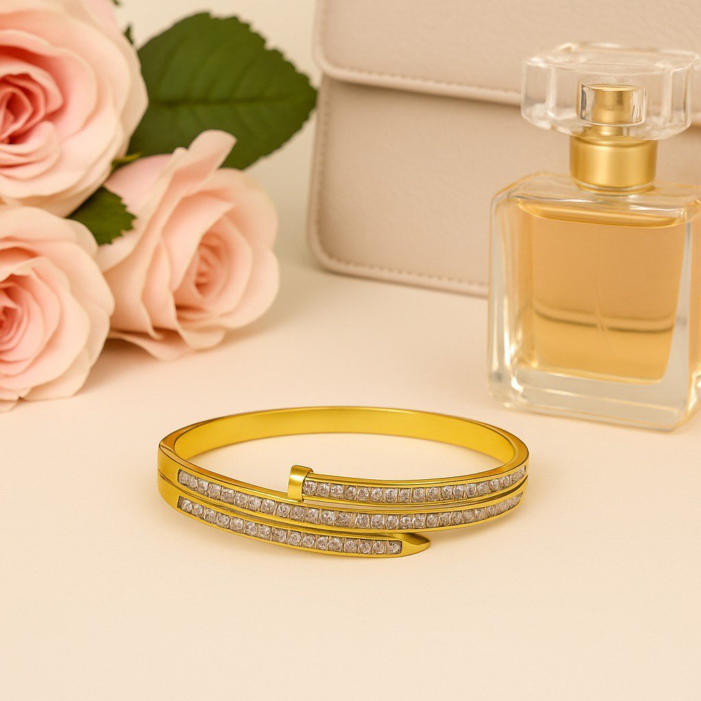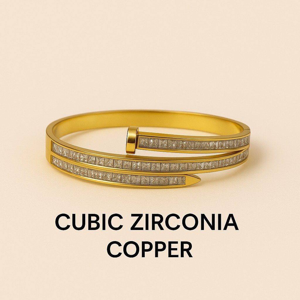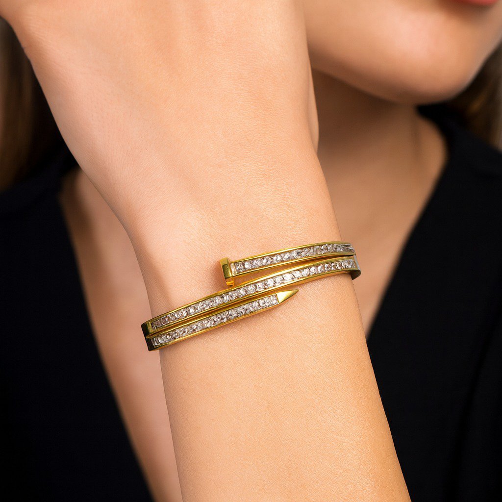 Glamorous Gold Plated Nail Bangle continuous line of brilliant, square-cut crystals creates an irresistible sparkle, tracing the elegant curve of the nail design. If you appreciate unique, trend-setting pieces with exceptional quality, this bangle is a perfect addition. For instance, it makes a powerful statement on its own, or you can stack it with other simple gold bracelets for a personalized, bold look. This specific 2.4 inch gold bracelet for women size offers a classic fit, providing the ideal blend of edgy style and refined glamour.