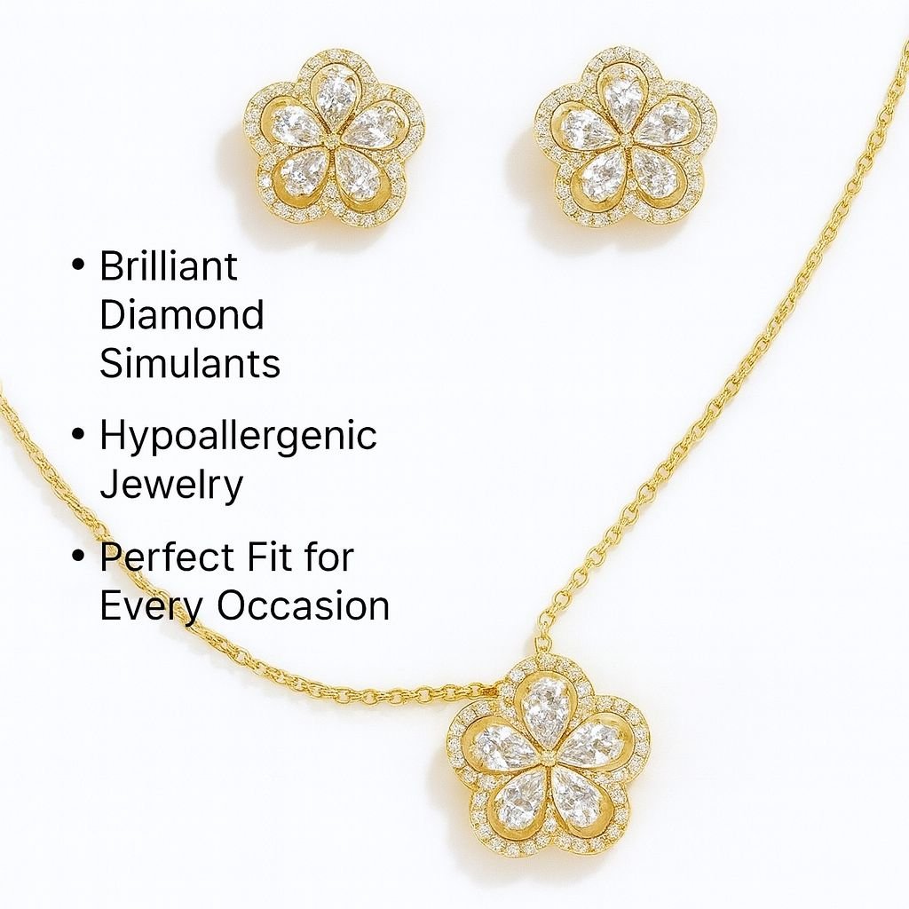 Discover subtle sophistication with this beautiful Gold Plated Floral Necklace Set. This elegant set features a delicate, five-petal CZ Floral Cluster Jewelry Set pendant and perfectly matching stud earrings. Therefore, this set is ideal for adding a touch of feminine sparkle to your everyday wardrobe or as a graceful accessory for a daytime event. The design features marquise-cut CZ stones forming the petals, surrounded by a delicate pave halo for maximum brilliance. This truly is the perfect Gold Plated Floral Necklace Set for those who appreciate understated elegance and nature-inspired beauty.