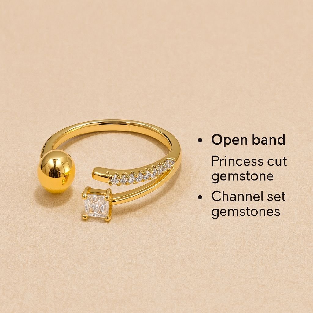 Minimalist Gold Plated Open Ring with Ball and Square CZ (Adjustable)
