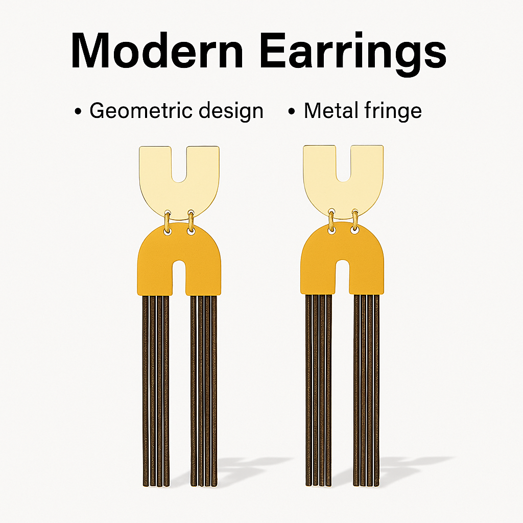 Make a contemporary art statement with the stunning Geometric Tassel Drop Earrings. These unique earrings are a study in contrasting shapes and colors, featuring a layered construction of two arch or semi-circular segments. Therefore, the top layer is a semi-translucent cream or clear resin/acrylic, connected to a bold mustard yellow segment below. This striking Resin Color Block Dangle Earrings design is finished with four sleek, dangling metal bar tassels in a dark tone (black or bronze), which create dynamic movement and an elongated, flattering profile. The piece perfectly embodies the Art Deco Style Dangling Earrings aesthetic, merging clean lines with dramatic flair.