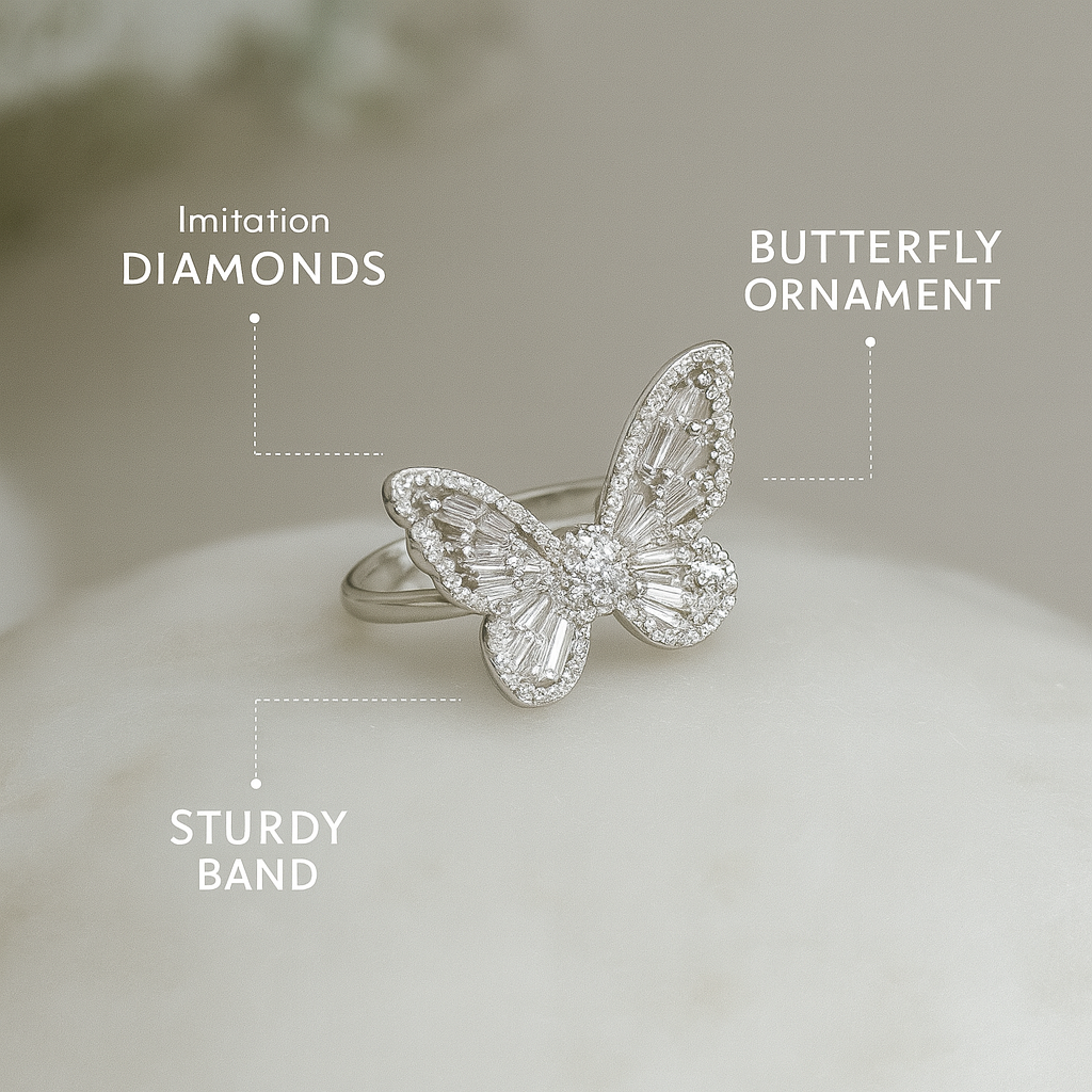 Experience dramatic luxury and meticulous quality without the commitment. We meticulously craft this exquisite Butterfly Baguette Ring with a durable, lustrous silver-toned plating, ensuring a rich, real-metal sheen. The design is spectacular: the clever placement of the baguette stones within the butterfly wings provides amazing texture and movement, creating a magnificent CZ Statement Cocktail Ring effect. Furthermore, we create all our jewelry to be skin friendly imitation jewellery, ensuring a comfortable and hypoallergenic experience, so you can wear this piece with confidence. Assuming this is an open ring style, the structure makes this a Hypoallergenic Adjustable Ring; consequently, it can easily accommodate approximate sizes around 2cm in diameter, offering a custom fit.