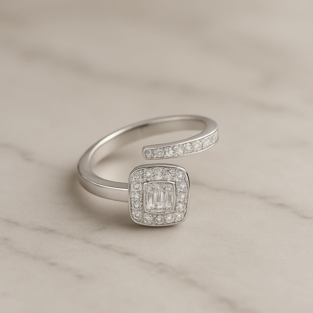 Make a bold, sophisticated statement with this gorgeous Women’s Silver Plated Ring. This unique open-style design features a striking square cluster centerpiece, dazzling with a combination of sleek baguette-cut and brilliant pave CZ stones. Therefore, it is the perfect accessory for both making a glamorous statement and showcasing modern, clean lines. The bold geometric shape and stunning CZ Pave Open Ring sparkle instantly elevate your hand to a high-fashion focal point. This truly is the perfect Women’s Silver Plated Ring for those who appreciate contemporary, opulent jewelry.
